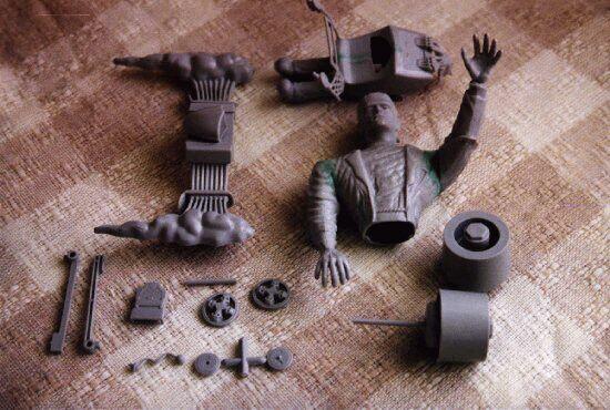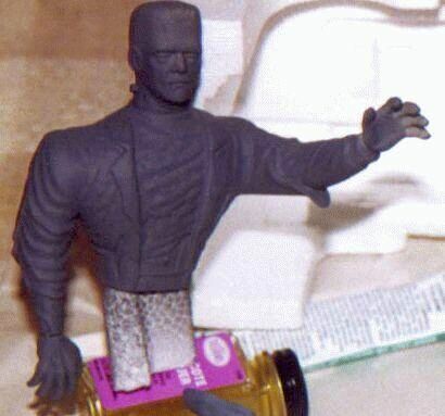 ![]() Since the original mold color is light gray, the darker primer was left in the depressions, and I 'dabbed' the paper towel along the sides and top, giving it a 'stone' look. Gargoyle Face: Again, sprayed it with KRYLON's primer, and then used a black 'wash' to bring out the details. I should have done the same thing with this as I did with the Headstone... think it would have looked more stone like if I had just wiped off the dark grey primer. Oh well! Frankie: Jacket & pants black, with a dark blue wash. Shirt was a light purple, shoes brown, with black soles. Face and hands a mild Olive green, with a darker green wash for around the eyes & cheek bones. Silver for the staples, and a light red wash for the gash on his forehead and along his jaw bone. Car Body: First thing I did was to get some Aluminium Foil and wrapped up Frankie's legs, the windshield/spiderwebs/headlights, and the Gargoyle's head. Then used PALMER Prism SUNLIGHT yellow, with about 8 drops of HOLLY BERRY red. Thinned it down with Glass Cleaner (generic brand of WINDEX), and sprayed it on. Painted the hands on the trunk an off-white with a light coating of black wash. Front wheels...rims & center black, skulls off-white. Back wheels black, with silver inside. Engine Block: Painted Silver, with the air scoop & pipe hoods Forest Green. Typical yellow/orange/red flames and white smoke tipped with a yellow wash at the ends. Yo-Yo: Was painted using 'Baltic' Blue.