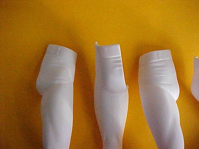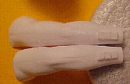 ![]() ![]() Taking each leg half in turn, I sand down the pants area to merge more into his legs, since Space Ghost doesn't have briefs. Sand down the round belt buckle and belt loops, leaving the outer edges of the center belt loops alone. This middle area of the belt will be painted red later on. Then sand off the boot tops. I found not putting the legs together, but keeping them just as they come off the sprues, was easier to get these areas sanded down flush. Using the lip of Superman's base, I cut off some of the edge and make up 6 small squares & place three on each arm.